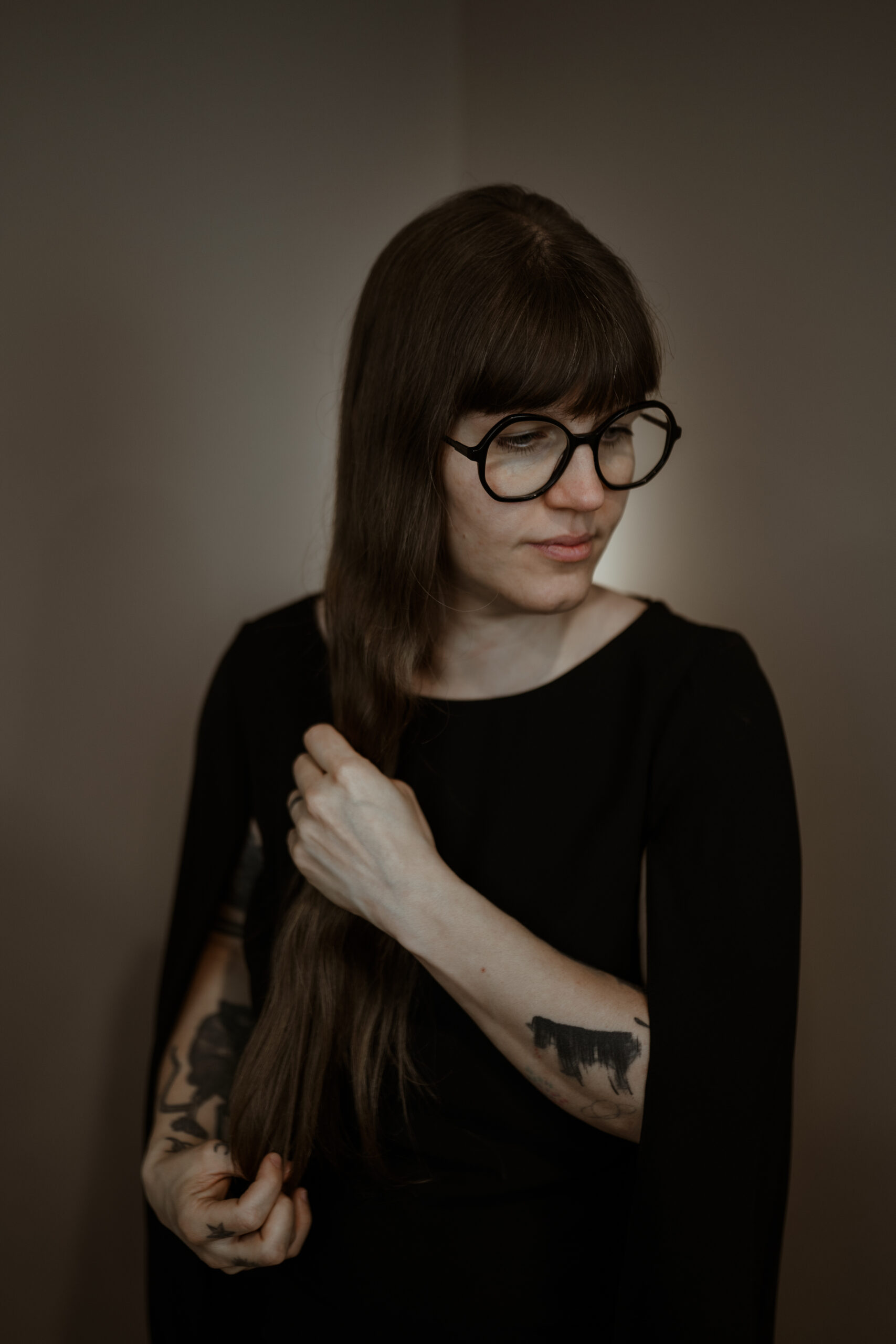 raised in an artistic environment and trained across visual disciplines, hayden’s relationship with art began early and has remained continuous throughout her life. over the past decade, this foundation has been concentrated and rearticulated through tattooing, developing through practice rather than theory. she did not set out to arrive at a particular style. instead, her work narrowed through elimination. elements that felt illustrative, decorative in an obvious sense, or easily resolved fell away. what remained was a visual language that holds tension without relying on narrative or fixed interpretation.